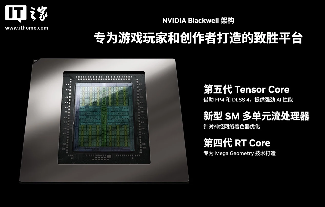 RTX 50 系显卡的提升我们在之前的评测中详细描述过,主要包括全新 Blackwell 架构、第五代 Tensor 核心、第四代 RT 核心、全新 DLSS 4 多帧生成技术所带来的性能提升。