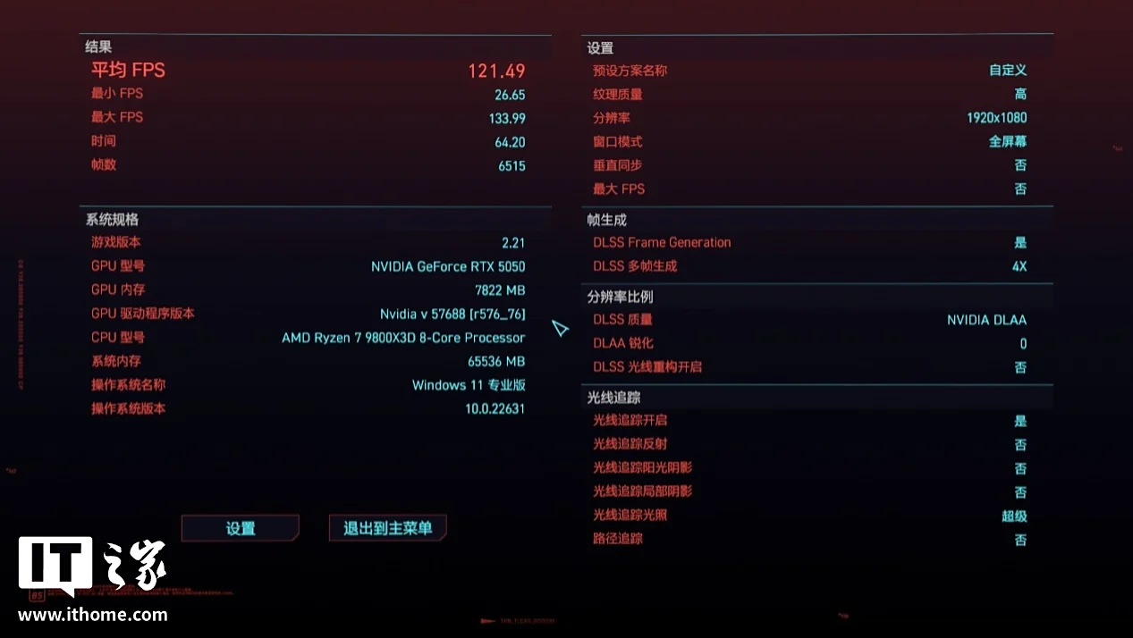 如果想要开启光追,就必须借助 DLSS 多帧生成的能力了,实测在 1080P 分辨率下,以超级光追画质 + DLAA 等级,分别开启 2x 和 4x 多帧生成,此时游戏平均帧数分别可以达到 61 帧和 121 帧,应对 1080P 下的光追游戏需求还是 OK 的。