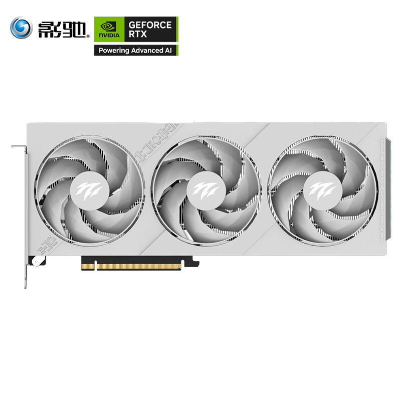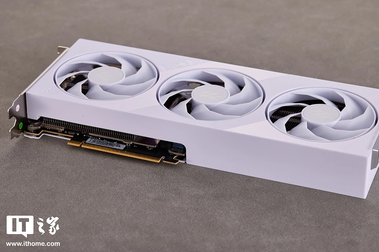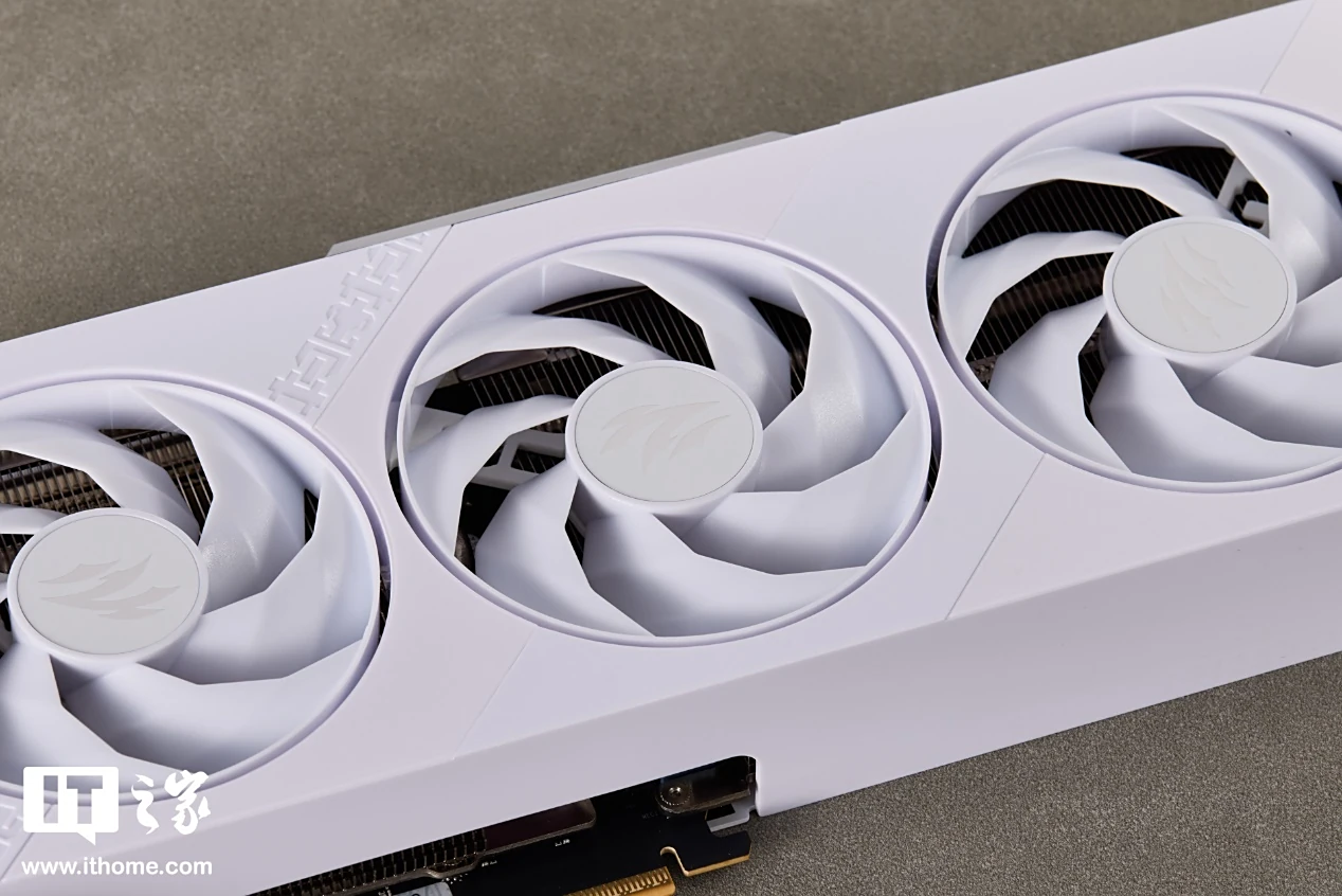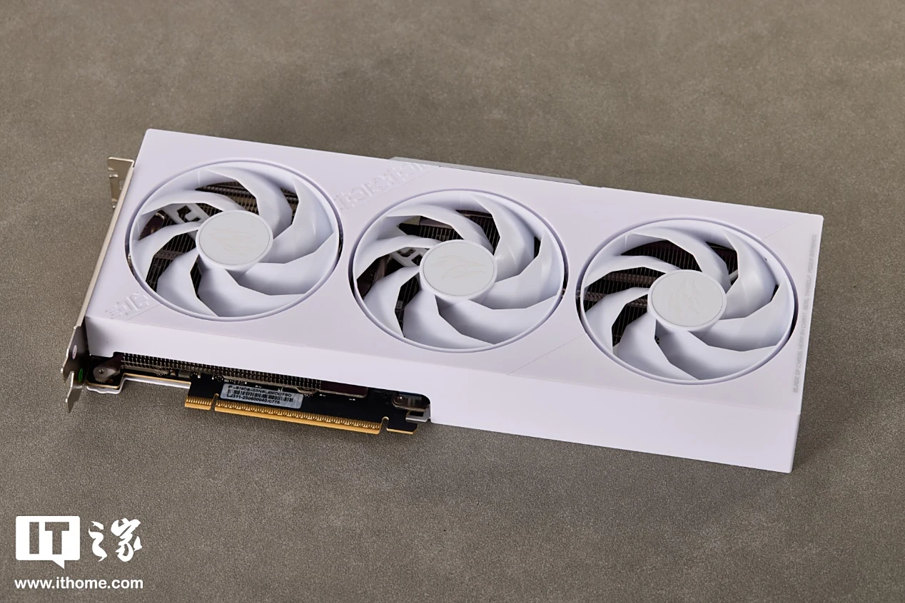 影驰 GeForce RTX 5050 圣刃 OC 显卡为白色涂装,卡身线条方正硬朗,正面配备 3 个 90mm 的霜环风扇,轴柱上印有刃系列标志性的爪痕图案。