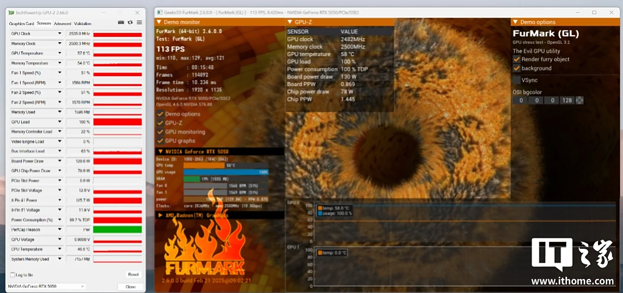 我们通过 FurMark 进行了 15 分钟烤机,此时的 GPU 功耗稳定在 130W,烤机时的 GPU 主频在 2530MHz 左右,与此同时显卡核心温度只有 57.6℃,显存温度 54℃,不到 60℃的表现,说明散热完全没有压力。