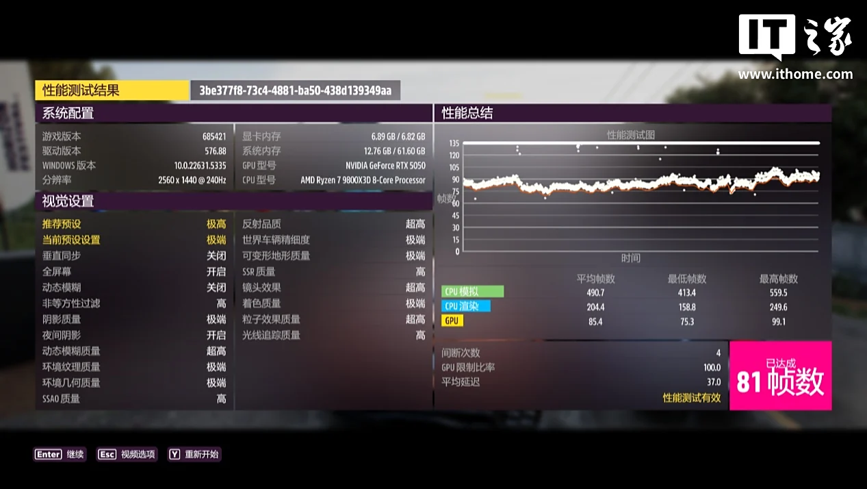 RTX 5050 在 2K 分辨率 + 极端画质下,游戏平均帧数 81 帧,1% Low 帧 71 帧;