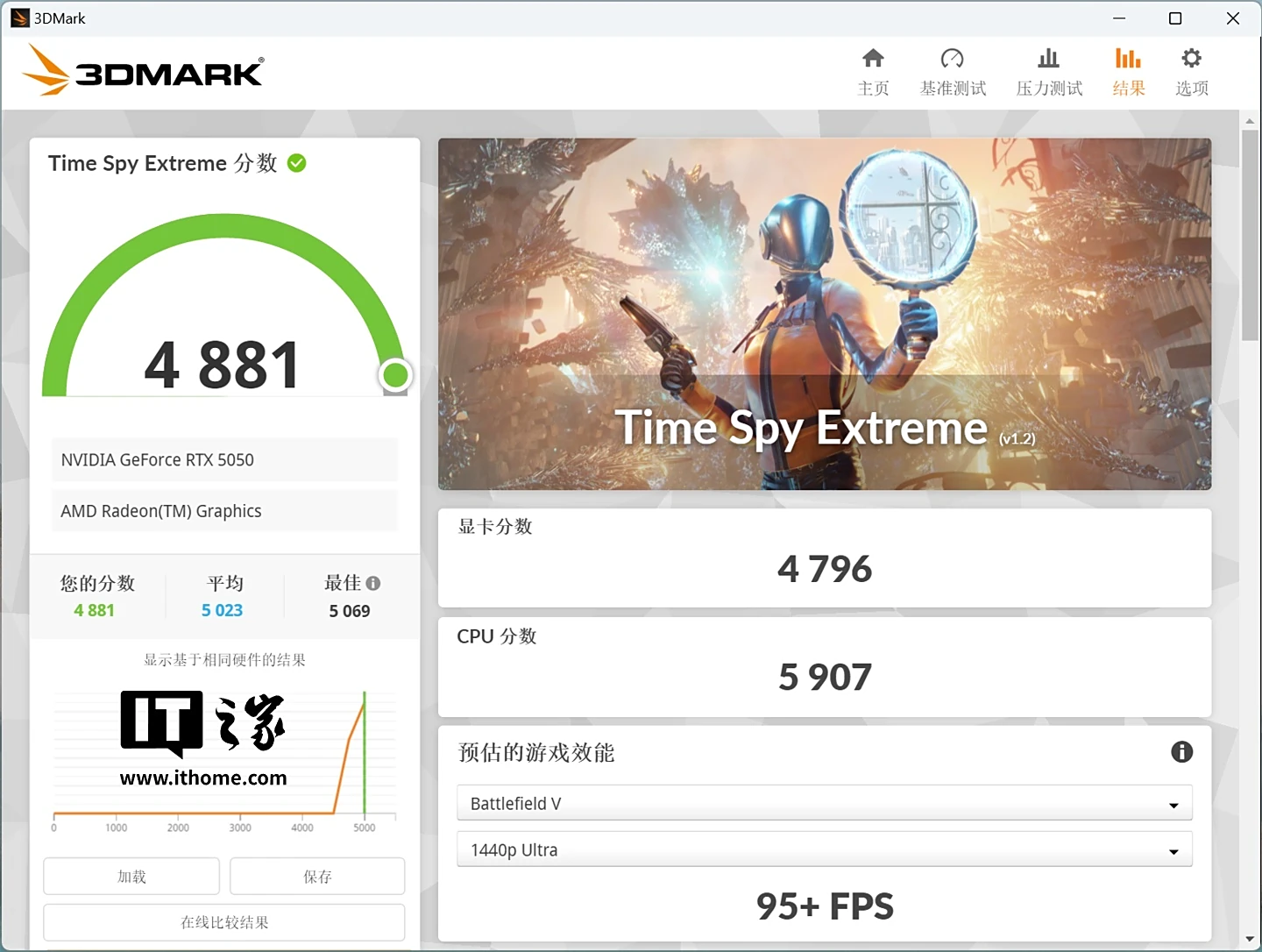 RTX 5050 的显卡分数为 4796 分;