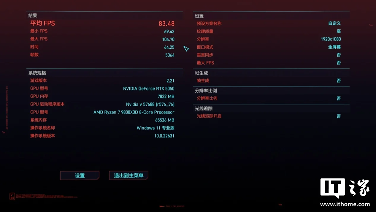 在《赛博朋克:2077》中,以 1080P 分辨率 + 超级画质运行游戏自带基准测试,游戏平均帧数能达到 83 帧,1% Low 帧也有 70 帧左右,游戏体验还算可以。不过,切换到 2K 分辨率后游戏平均帧数只有 49 帧,无法满足基本的流畅游玩需求。