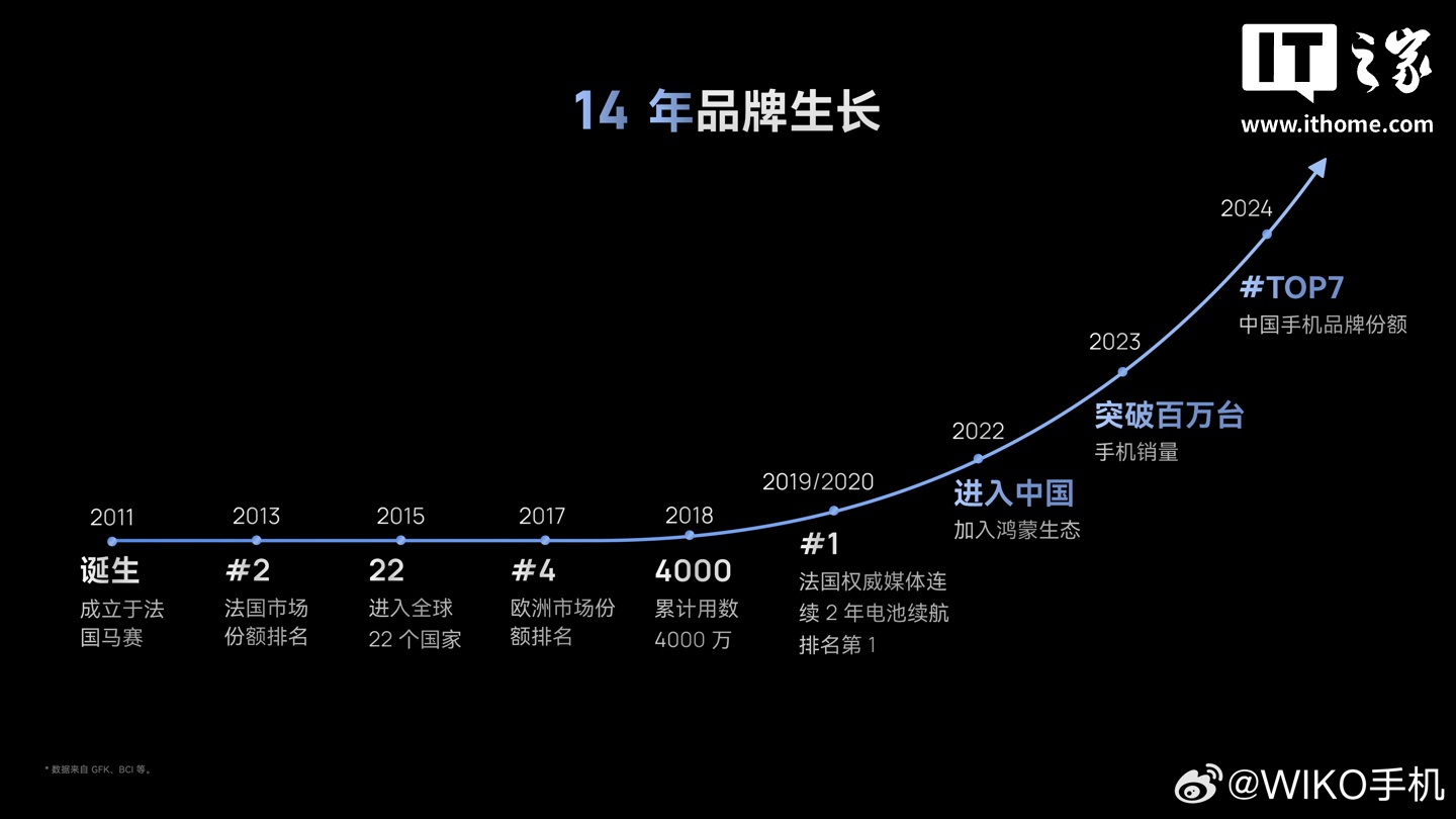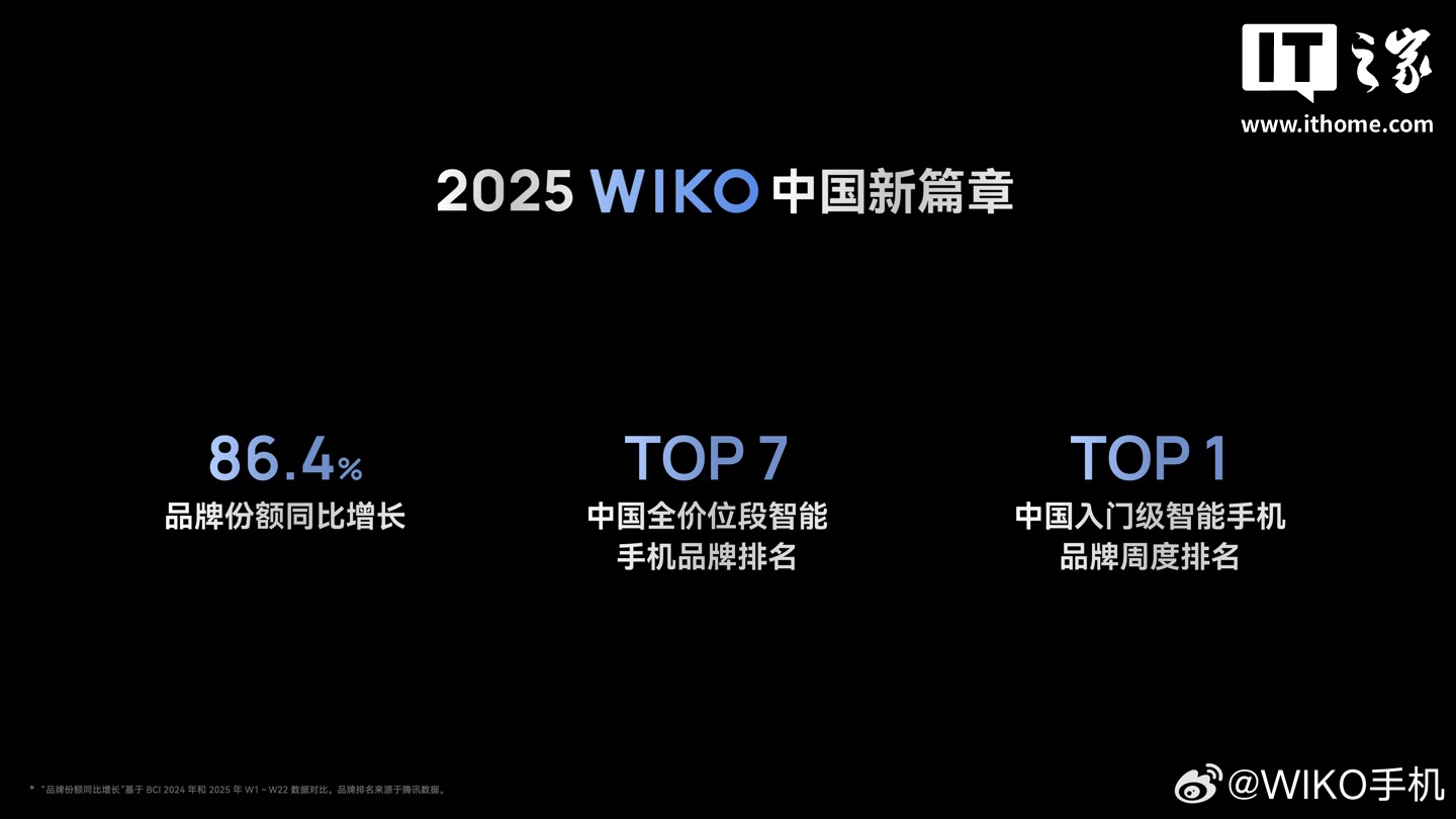 IT之家从 WIKO 官方获悉,WIKO 品牌 2023 年手机销量突破百万台、2025 年份额同比增长 86.4% ,居中国智能手机市场第七名,并一度在入门级档位登顶第一。