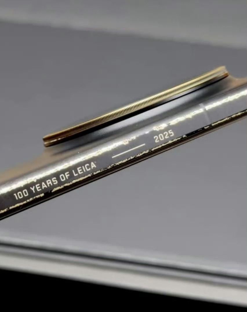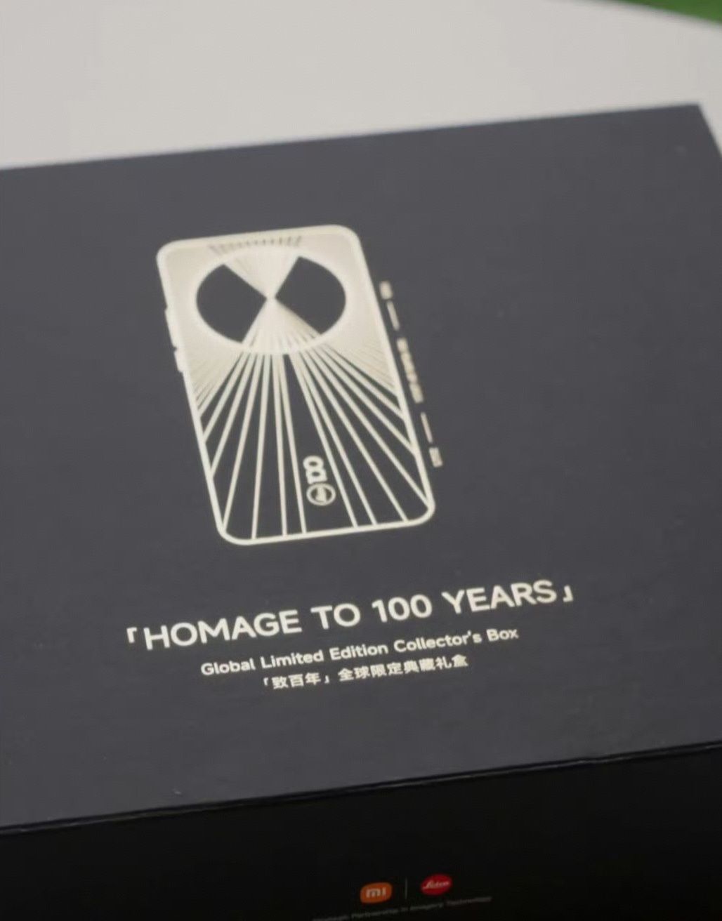 手机金属边框上刻有“100 Years of Leica 1925 – 2025”字样,背面同时印有小米 LOGO 和专为此次百年庆典定制的“徕卡 100”标志。