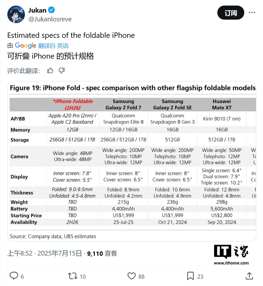 IT之家 7 月 16 日消息,消息源 @Jukanlosreve 昨日(7 月 15 日)在 X 平台发布推文,分享了瑞银(UBS)报告的更多细节,称苹果首款折叠 iPhone 将采用 A20 Pro 芯片,内存为 12GB。