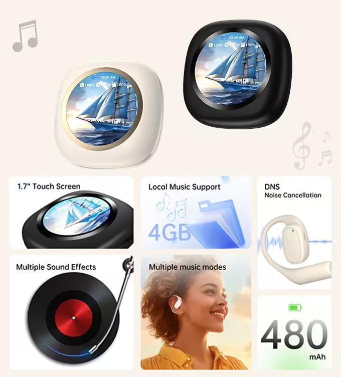 Wave X5L 耳机的充电盒内置 1.7 英寸显示屏,分辨率为 360×360。触摸屏除可让用户控制音量外,还支持查看通知、设置计时器、使用秒表和查看天气预报。