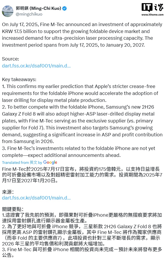三星的折叠屏面板铰链供应链 Fine M-Tec 于 7 月 17 日宣布,将投资约 175 亿韩元(IT之家注:现汇率约合 9031.8 万元人民币)以支持日益发展的折叠屏设备市场以及对超精密激光加工能力的需求。郭明錤基于此消息,预测苹果折叠屏 iPhone 将推动搭载激光钻孔技术的显示屏金属面板的生产。