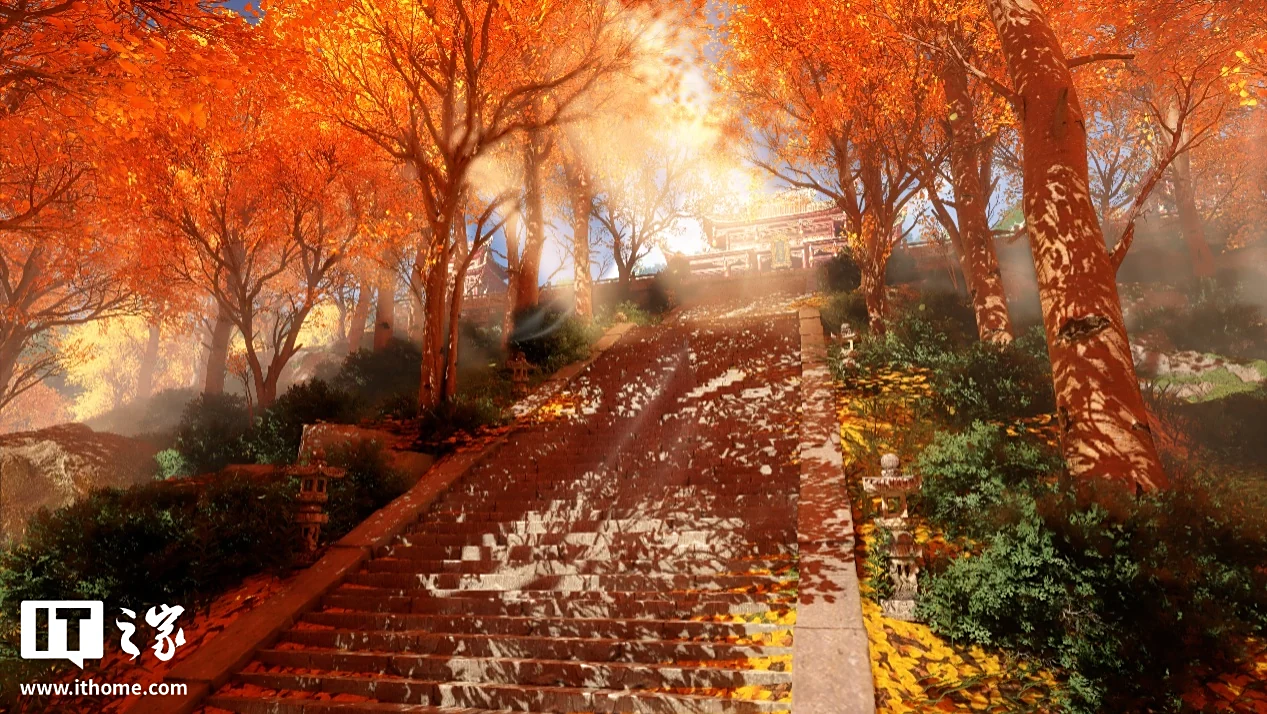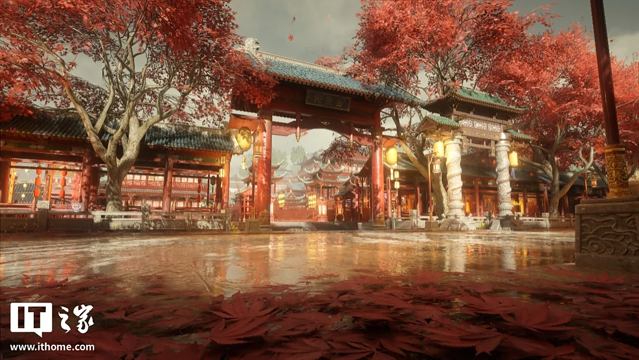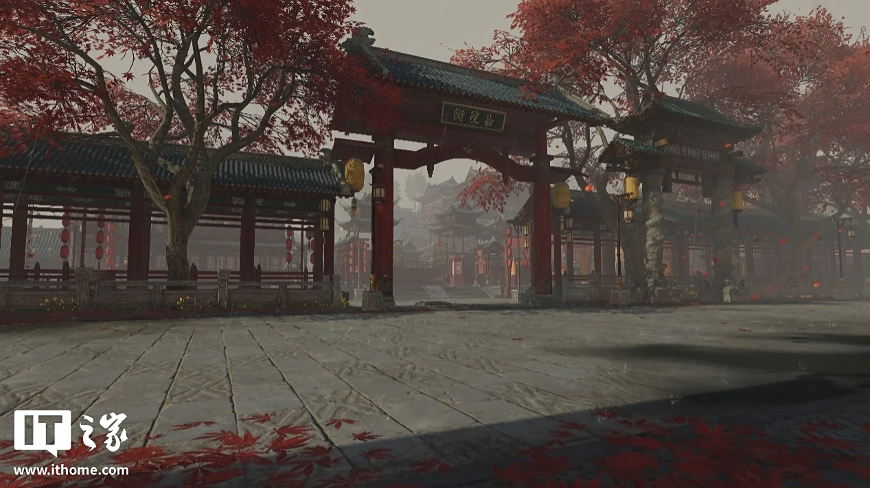 走出天后宫,眼前的景色极为惊艳。在 5 月份的新地图《枫林小筑》中,满是枫树的戏院外小道,已然充满了国风美学。而天后宫门前的朝圣台阶,在全景光追的加持下,将丁达尔效应所展现出的光影美学表现到了极致,这种极尽夸张和华丽的红色,也代表了刺桐港的火热与奔放。