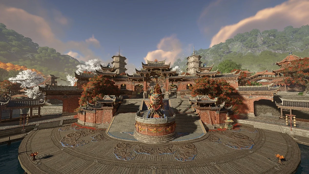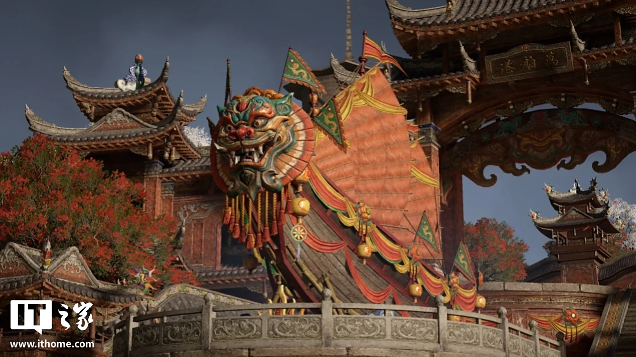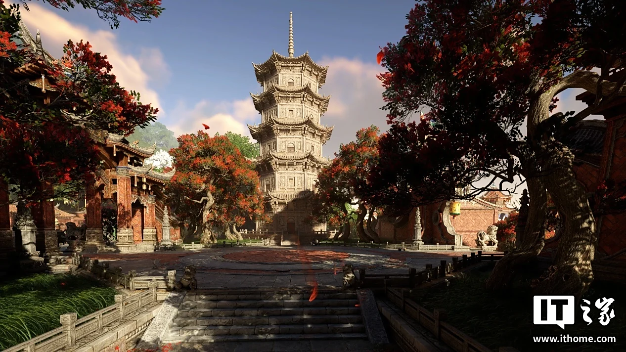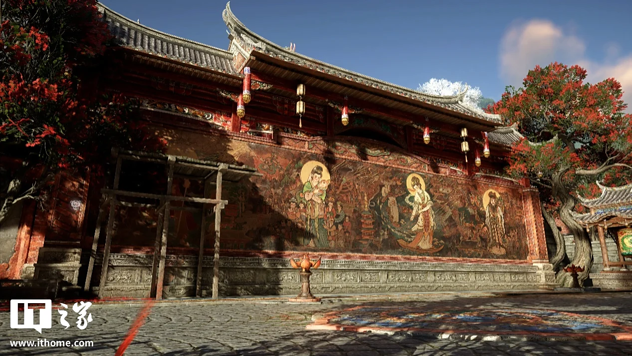 走出天后宫,眼前的景色极为惊艳。在 5 月份的新地图《枫林小筑》中,满是枫树的戏院外小道,已然充满了国风美学。而天后宫门前的朝圣台阶,在全景光追的加持下,将丁达尔效应所展现出的光影美学表现到了极致,这种极尽夸张和华丽的红色,也代表了刺桐港的火热与奔放。