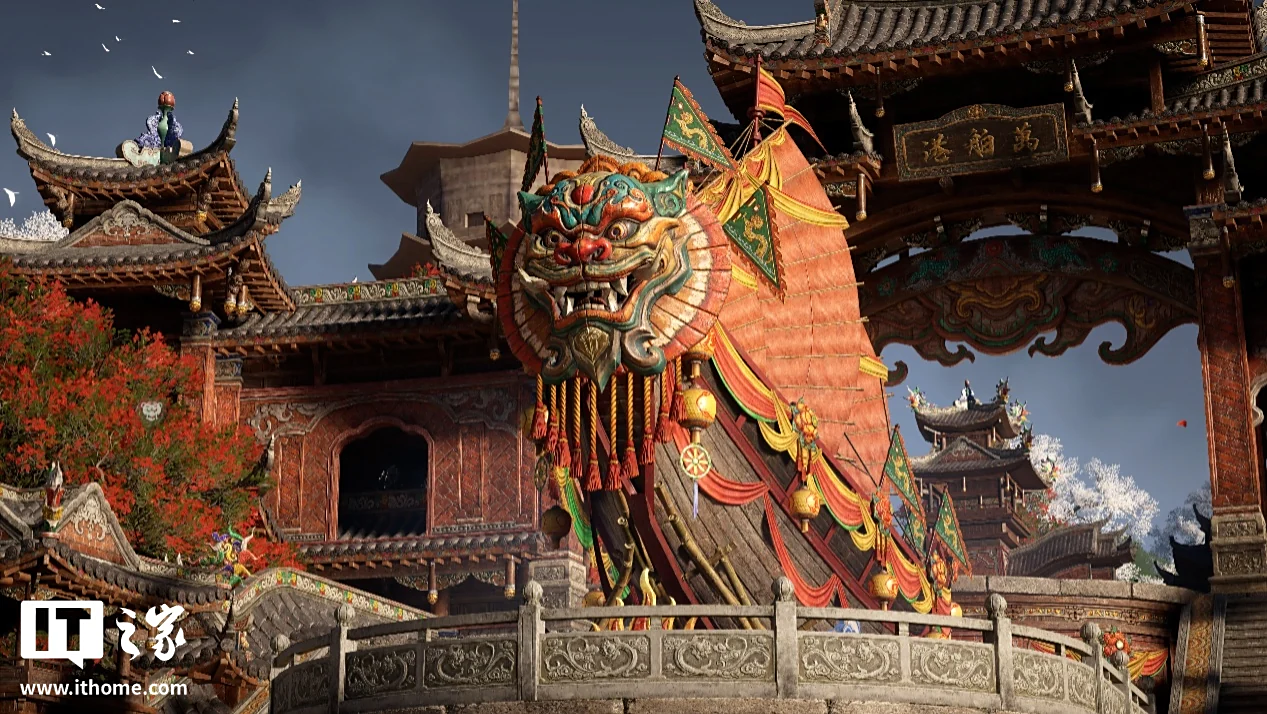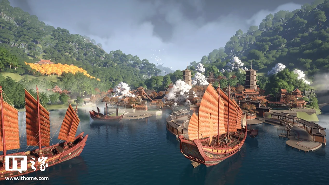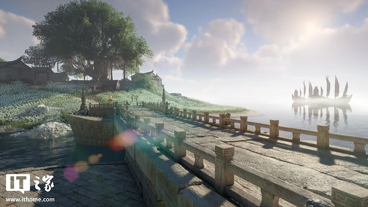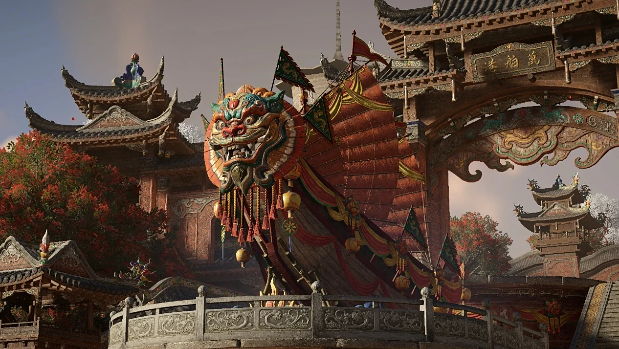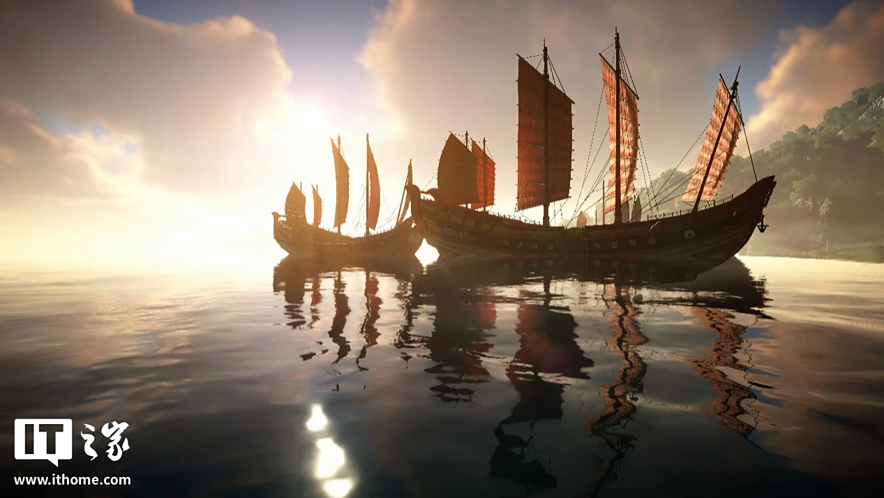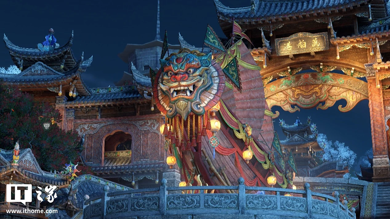 港口处最显眼的就是这艘兽面船了,它作为整个港口的地标之一,融入了民俗文化和海贸精神,通过全景光线追踪的实时全局光照,在一天中的每个时段都你能呈现出不同的光影效果。