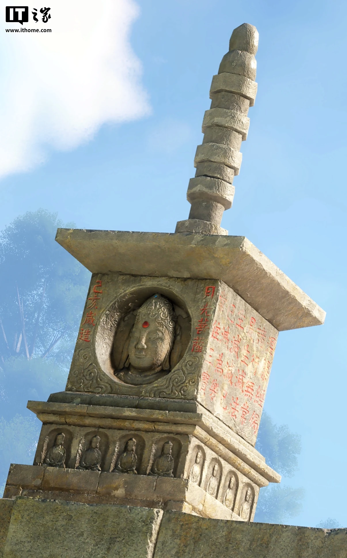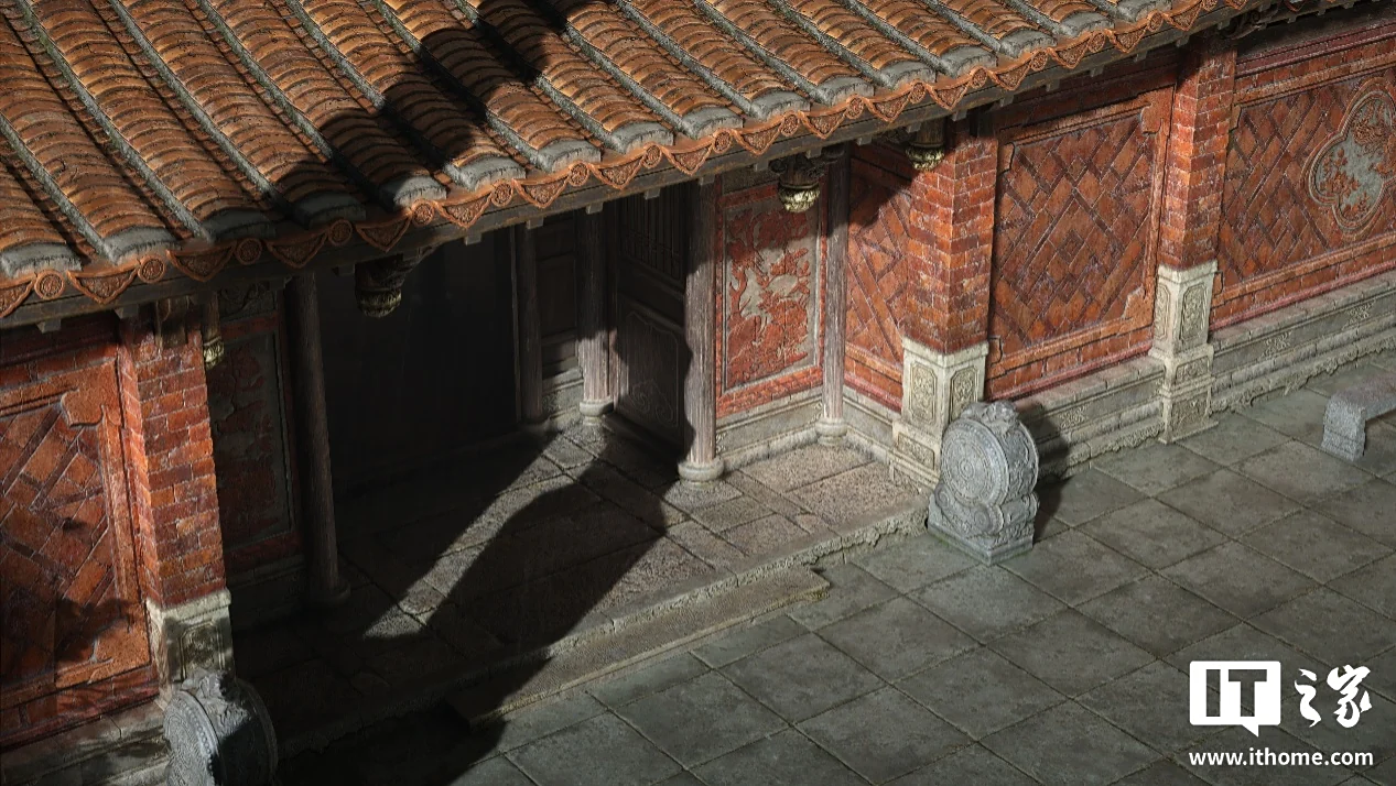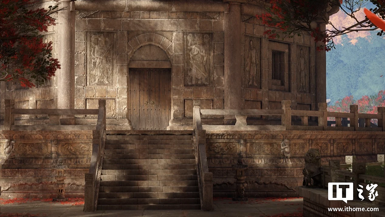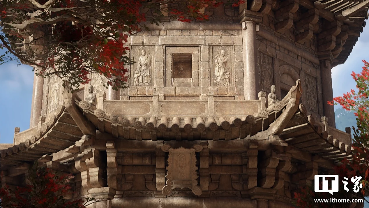 以仁寿塔为例,走进观察就会发现塔身细节满满,从宝塔上各种菩萨、罗汉、武将等雕像,到每层塔檐下方仿木构建筑“斗拱”的石刻版,假门和假窗、檐砖上的兽面图案,再到充满岁月痕迹的砖石和木门,除了不能上手摸和上塔,真就和玩家亲临实地游览一般。即使大家心里都知道这是通过数字扫描、3D 建模和贴图复现的,但在全景光追加持下,宝塔的轮廓和砖石和层次感、浮雕的立体感都更加生动饱满。