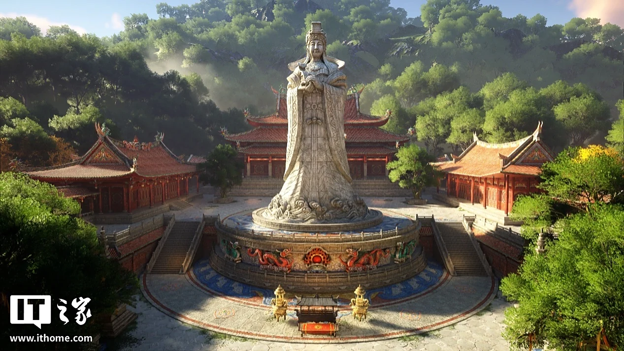 30 米高的妈祖巨像也被“寒子”搬到了游戏中,雕像的还原度足够高,无论是服饰纹理、表情动作还是褶皱和质感,都做得非常细节和逼真。夕阳时分太阳还未落山,阳光照射在妈祖像前方的香炉前,仿佛在暗示着什么。三座宝殿加持,足见其地位的重要性。