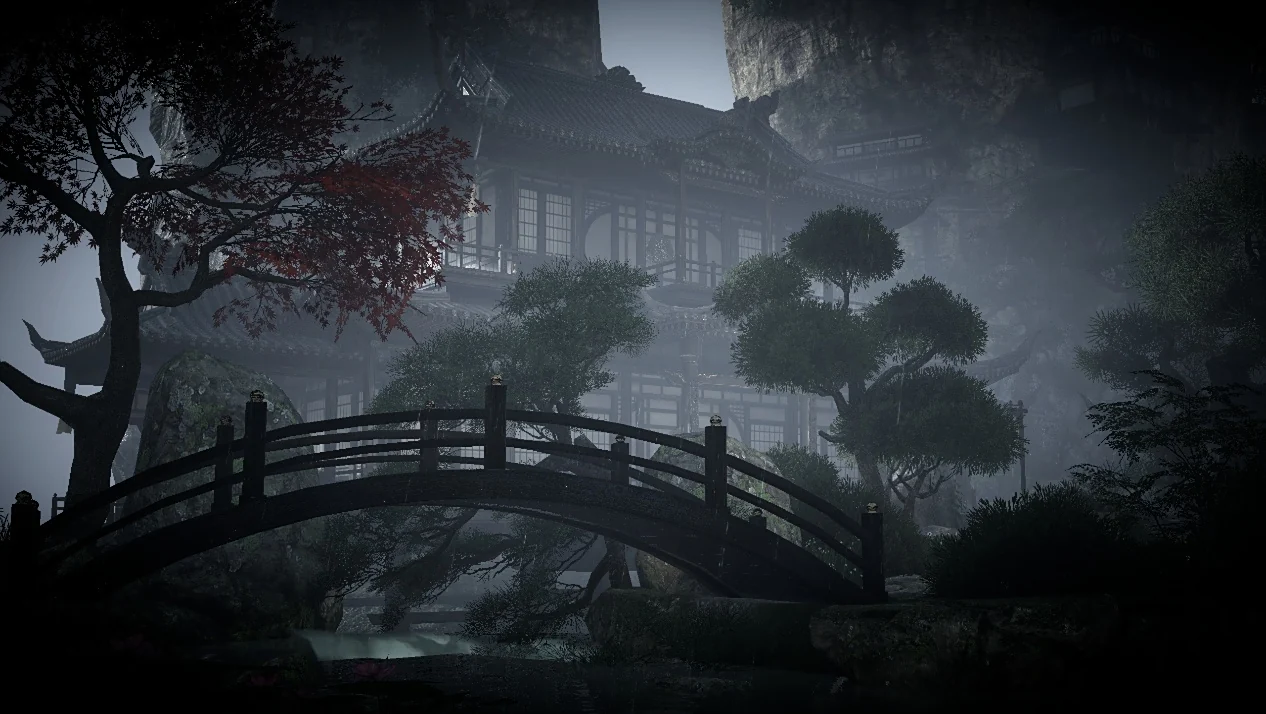 这是同一个游戏吗?借助游戏的全局光照特性,即便是雨天但呈现的优先级被放在“中午”这个时段,因此能看到树枝投射在青色瓦片上的光影效果,牌坊瓦檐下暗光环境呈现出的阴影表现,很像雨后太阳从云层中复出的感觉。至于牌坊右侧那些亮得发光、过曝严重的黄灯笼,实际上是拍照模式中默认开启 5 级柔光效果的“锅”,只要把柔光拖到 0 级就正常了。