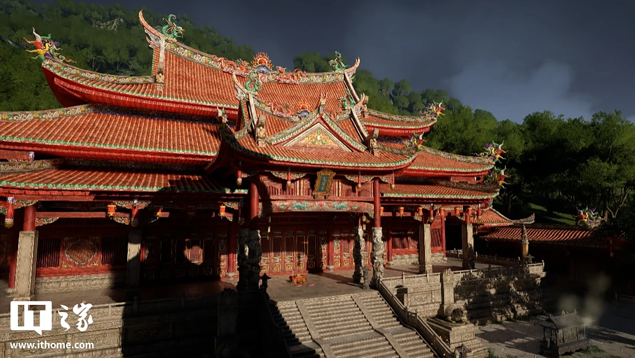妈祖巨像背后天后宫也是同样的壮阔和气派,第一眼看过去有点汴京建筑红灿灿的既视感,但檐廊砖瓦随处可见的显眼涂装和雕刻,无不透露出南洋气息,在光追加持下显得更加富丽堂皇。