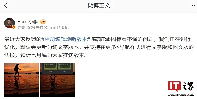 IT之家注意到,小米相机部的产品经理 @Bao_小李 昨日发文回应了“相册编辑焕新版本底部 Tab 图标看不懂”的问题,称正在进行优化,默认会更新为纯文字版本,并支持在更多 > 导航样式进行文字版和图文版的切换,预计 7 月底推送版本。