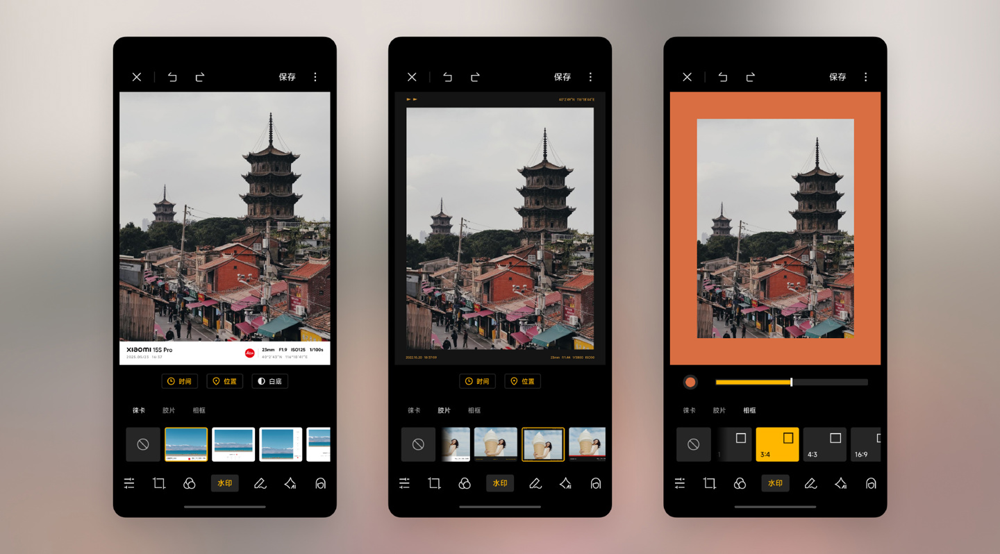 重新思考水印画框和相框的功能定位,对其进行了功能上的合并,同时也把原来 REDMI 系列胶片水印带到了小米机型上,用户能有更多水印画框选择。
