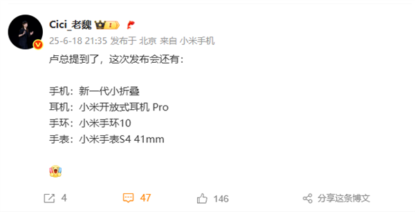 可穿戴新品也很丰富,包括小米AI眼镜、小米开放式耳机Pro、小米手环10、小米手表S4 41mm。