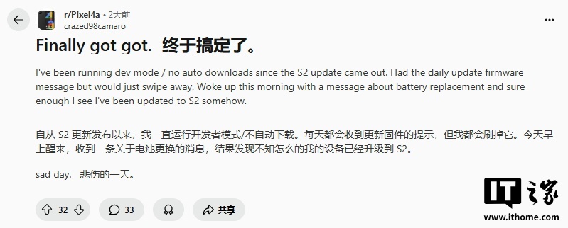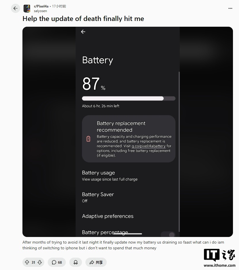 IT之家此前报道,Pixel 6a 和 Pixel 4a 手机出现了多起电池爆炸事件,因此谷歌决定通过强制性更新,在这两款手机中部署电池调整,限制充电容量并降低性能。