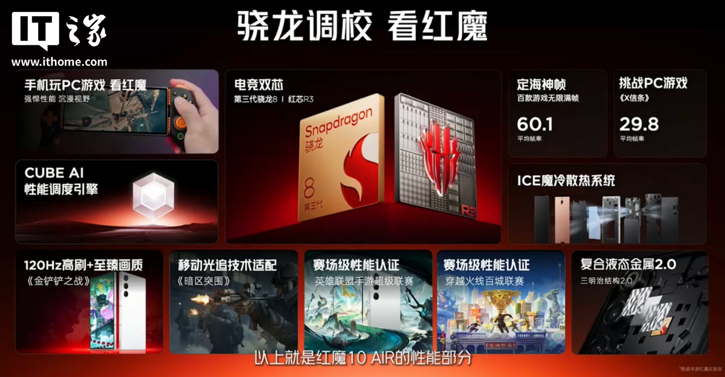 另外,红魔 10 Air 还支持红魔姬“陪伴”和“嘴替”功能;配有 520Hz 双 IC 触控游戏肩键,支持毫秒级响应、超大触控面积、防手汗算法;以及 0815 X 轴线性马达、立体声扬声器、Wi-Fi 7、5G 电竞通信。