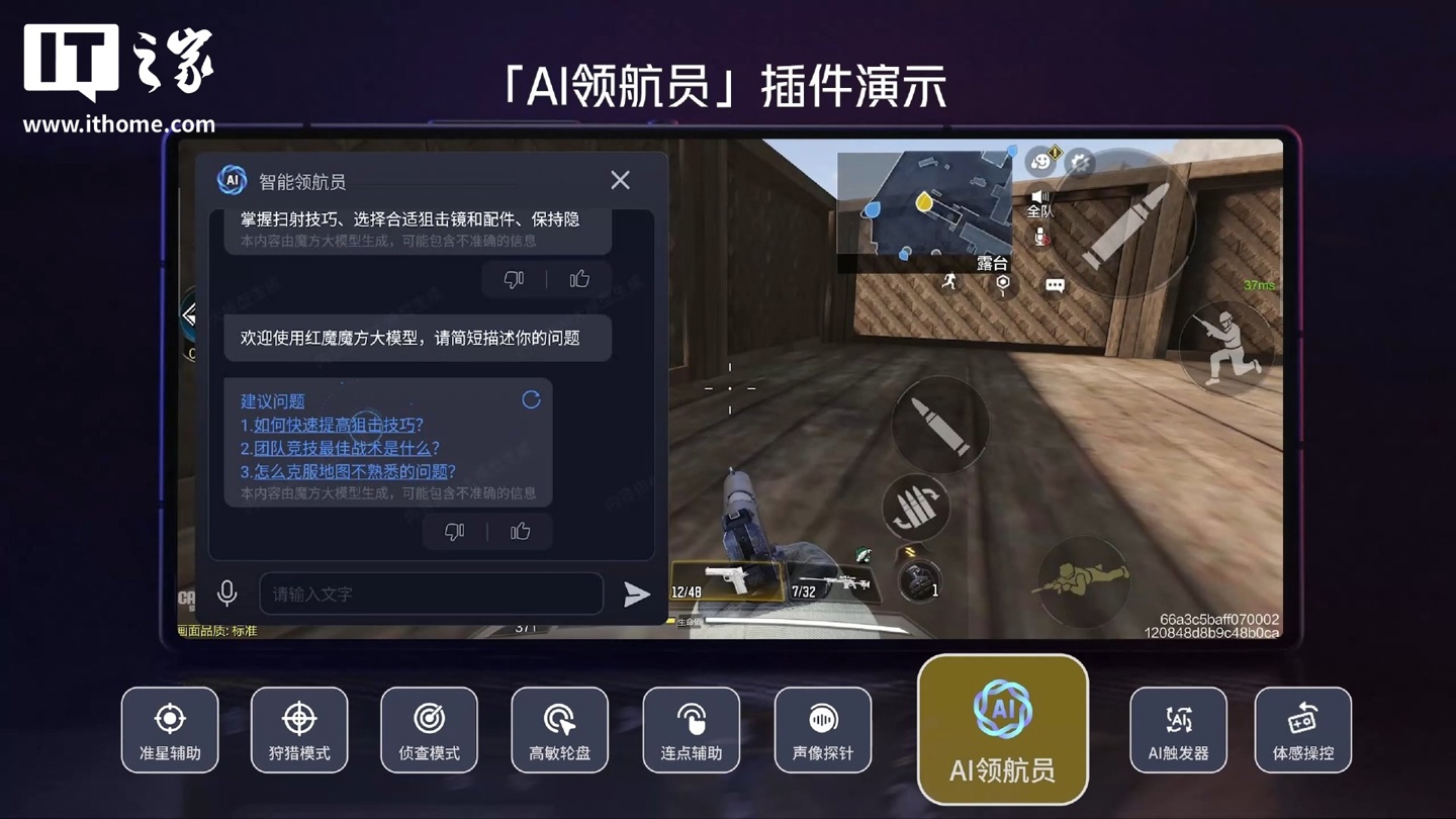 红魔 10 Air 手机支持游戏 AI 插件,包含“9 大逆天游戏插件”,分别是:准星辅助、狩猎模式、侦查模式、高敏轮盘、连点辅助、声像探针、AI 领航员、AI 触发器、体感操控。