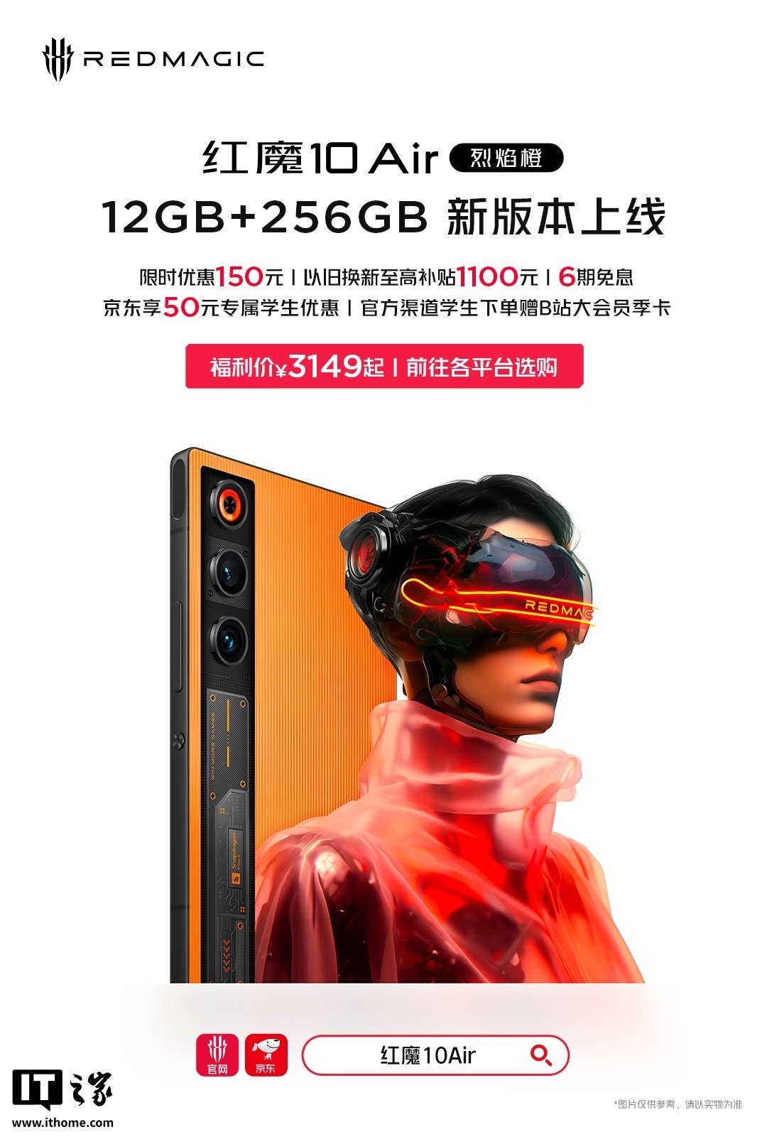 IT之家 7 月 22 日消息,红魔游戏手机官方今日宣布,红魔 10 Air“烈焰橙”配色「12GB+256GB」新版本上线,购机可享 150 元限时优惠、学生福利、6 期免息等权益,定价 3299 元、首发 3149 元。