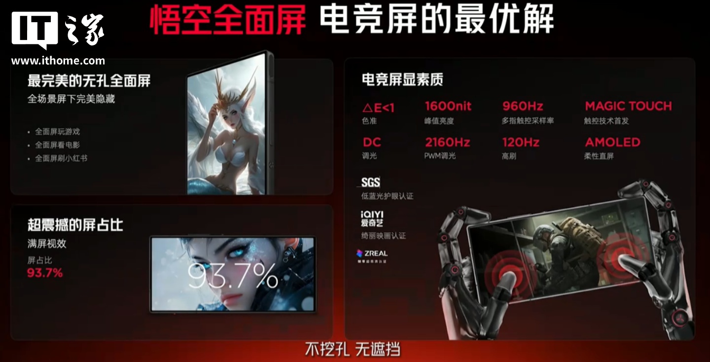 该机搭载 6.8 英寸“悟空全面屏”,屏占比达 93.7%,配有屏下摄像头,搭载屏下人像算法 4.0;支持 1600 尼特峰值亮度、2160Hz PWM 调光、120Hz 高刷;首次搭载 MAGIC TOUCH 技术,响应速度提高 20%,瞬时触控采样率 2000Hz、多指触控采样率 960Hz。