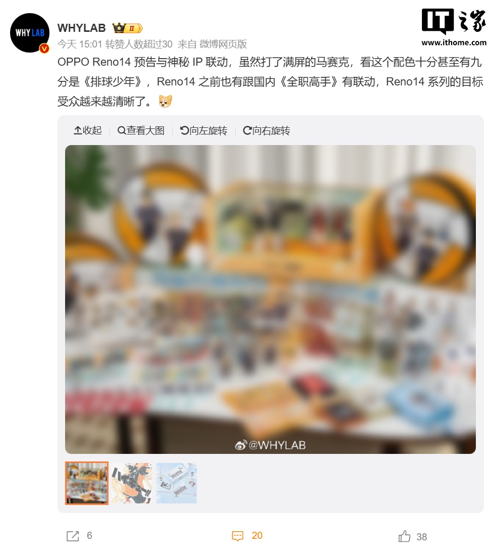 博主 @WHYLAB 今天中午发文称,OPPO Reno 14 正准备预告与神秘 IP 联动,并放出了一张经过模糊处理的预告图。他认为“看这个配色十分甚至有九分是《排球少年》”,并称“Reno 14 系列的目标受众越来越清晰了”。