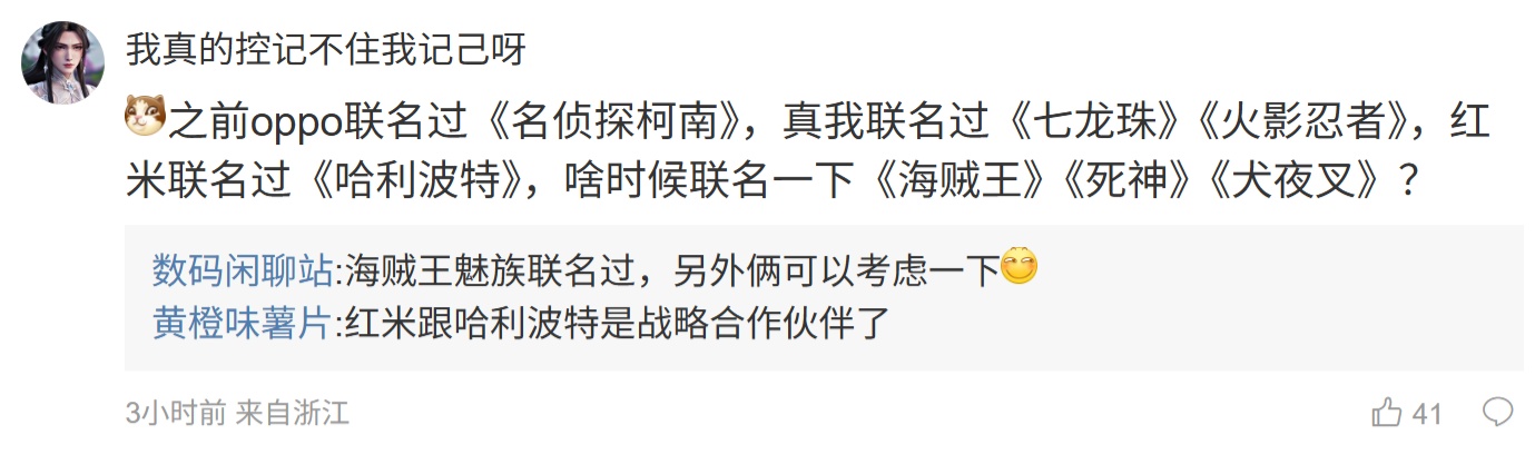 有用户在评论区询问道:“之前 OPPO 联名过《名侦探柯南》,真我联名过《七龙珠》《火影忍者》,红米联名过《哈利波特》,啥时候联名一下《海贼王》《死神》《犬夜叉》?”