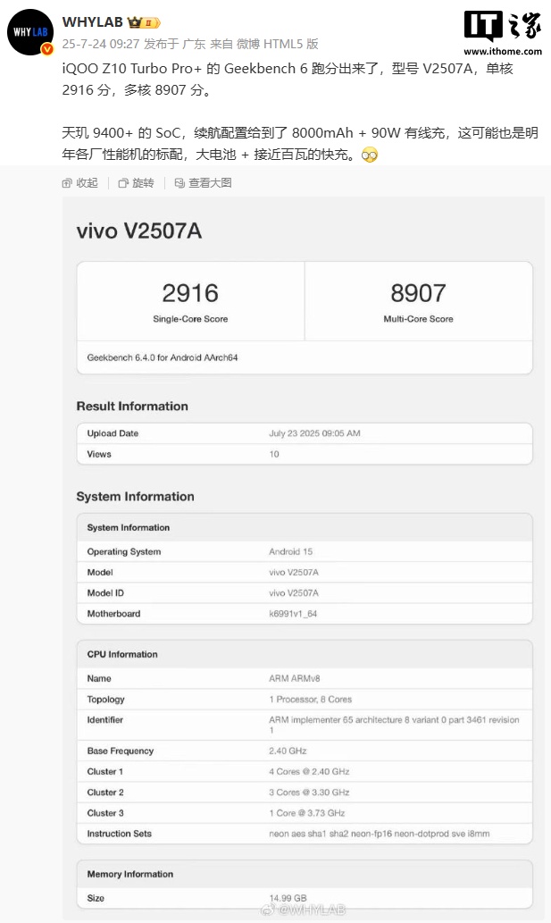 IT之家 7 月 24 日消息,一款型号为 V2507A 的 vivo 新机昨日现身 Geekbench 跑分平台,博主 @WHYLAB 透露该机为 iQOO Z10 Turbo Pro+。