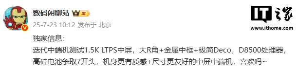 IT之家注意到,该博主此前曾爆料某厂商子系迭代中端机测试 6.6″±1.5K 大 R 角中屏,该机同时配备金属中框、轻薄大电池,预计两款产品为同一型号。