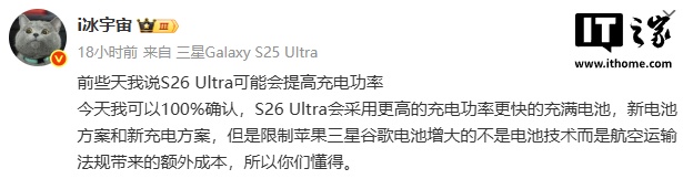 此前,该博主称,S26 Ultra 会采用更高的充电功率更快的充满电池,新电池方案和新充电方案,但是限制苹果三星谷歌电池增大的不是电池技术,而是航空运输法规带来的额外成本。