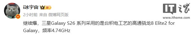 IT之家 7 月 24 日消息,博主 @i冰宇宙 今日带来三星 Galaxy S26 系列手机最新爆料,该系列机型搭载骁龙 8 Elite2 for Galaxy 芯片,频率达到 4.74GHz。