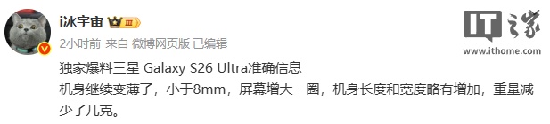 该博主还爆料称,三星 Galaxy S26 Ultra 机身继续变薄了,小于 8mm,屏幕增大一圈,机身长度和宽度略有增加,重量减少了几克。此外,这款旗舰新机将配备 5000mAh 电池 + 60W 快充。