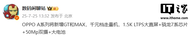 IT之家 7 月 25 日消息,博主 @数码闲聊站 今日爆料称,OPPO A 系列将新增 GT 和 MAX 机型,千元档走量机,配备 1.5K LTPS 大直屏 + 骁龙 7 系芯片 + 50Mp 双摄 + 大电池。