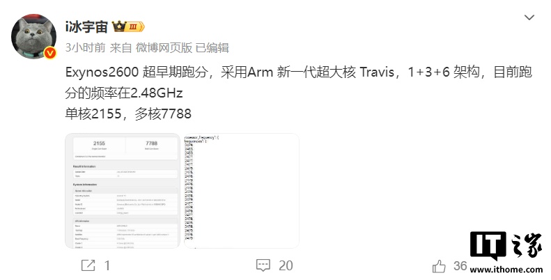 博主 @i冰宇宙 也称这是 Exynos 2600 的超早期跑分,采用 Arm 新一代超大核 Travis。