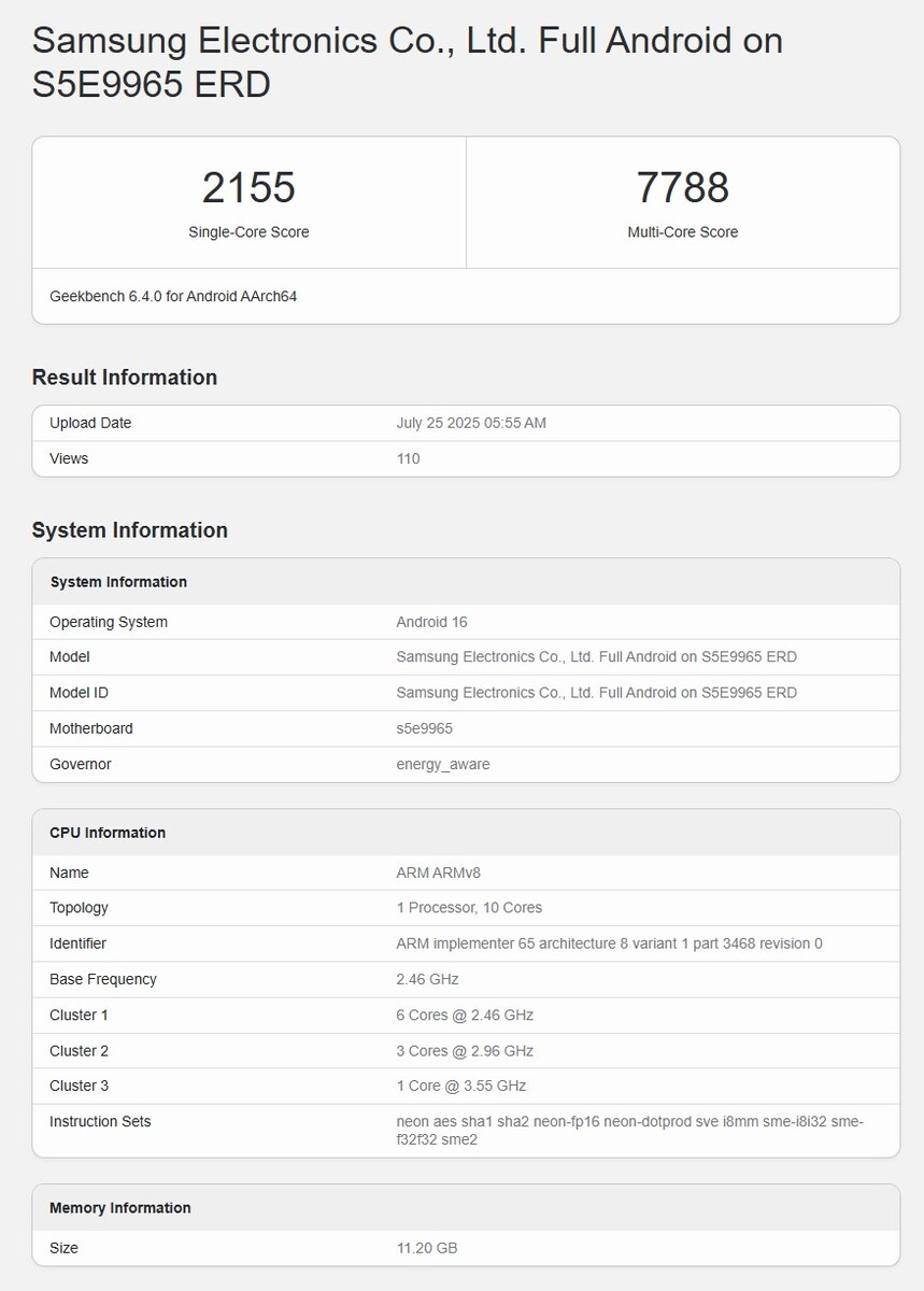 此次泄露的跑分为单核 2155 分、多核 7788 分,仅比三星 Galaxy Z Flip7 中搭载的 Exynos 2500 略高一些,因此不确定是否为最终性能。