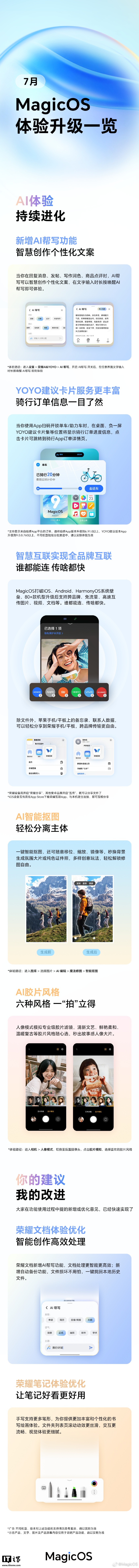 IT之家 7 月 25 日消息,荣耀 MagicOS 今天发文,带来 MagicOS 七月体验升级一览,更新 AI 帮写、YOYO 建议卡片、智慧互联等功能。