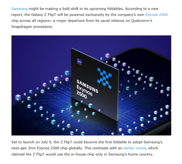 【CNMO科技消息】根据此前流出的消息,三星Z Flip7将提供两种芯片版本:欧洲和韩国版本采用三星自研的Exynos 2500,中国和美国版本采用高通骁龙移动平台。然而最新的爆料显示,三星可能会在Z Flip7全面采用自研芯片。这一变化若属实,将是三星在高端移动芯片战略上的重大调整。