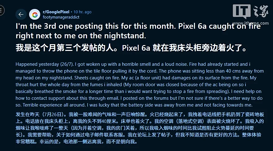 IT之家 7 月 27 日消息,有用户在 Reddit 发帖称,他周五早晨被一声巨响惊醒,随后闻到一股刺鼻的气味,随后发现自己的 Pixel 6a 手机已经起火。当时,这部手机正放在床头柜上,距离他的头部仅 40 厘米。由于火势蔓延,床单也被点燃,该用户吸入了大量浓烟,导致喉咙不适,整个白天都感到不适。