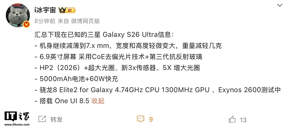 IT之家 7 月 28 日消息,博主 @i冰宇宙 发文,对目前已知的三星 Galaxy S26 Ultra 手机进行汇总。