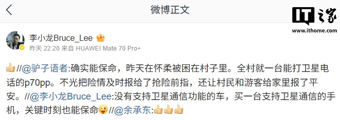 华为终端 BG CTO 李小龙转发并评论:“没有支持卫星通信功能的车,买一台支持卫星通信的手机,关键时刻也能保命”。随后有网友留言分享了自己的靠卫星通信手机的脱困经历,据其描述,他前天被困在怀柔一村落,全村仅有一台可以打卫星电话的华为 Pura70 Pro+ 手机,村民和游客靠该手机及时上报了险情,并同家里人报了平安。