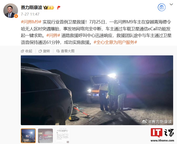 IT之家 7 月 29 日消息,赛力斯集团副总裁康波在本月 27 日分享了问界 M9 汽车实现了行业首例卫星救援的案例。据其分享的内容来看,7 月 25 日,一名问界 M9 车主在穿越青海德令哈无人区时突遇爆胎,事发地网络完全中断,车主通过车载卫星通信 eCall 功能发起一键求助。