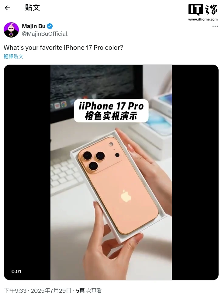 IT之家 7 月 30 日消息,爆料人 Majin Bu 昨天在 X 平台放出了一段苹果 iPhone 17 Pro 橙色机模的上手视频。