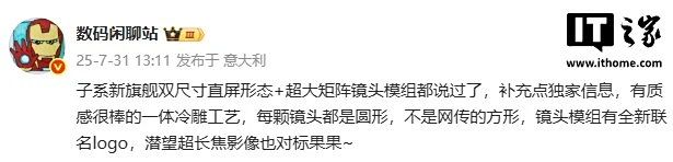 据爆料,该系列新旗舰采用双尺寸直屏形态 + 超大矩阵镜头模组,有质感很棒的一体冷雕工艺,每颗镜头都是圆形,不是网传的方形,镜头模组有全新联名 logo,潜望超长焦影像也对标苹果。