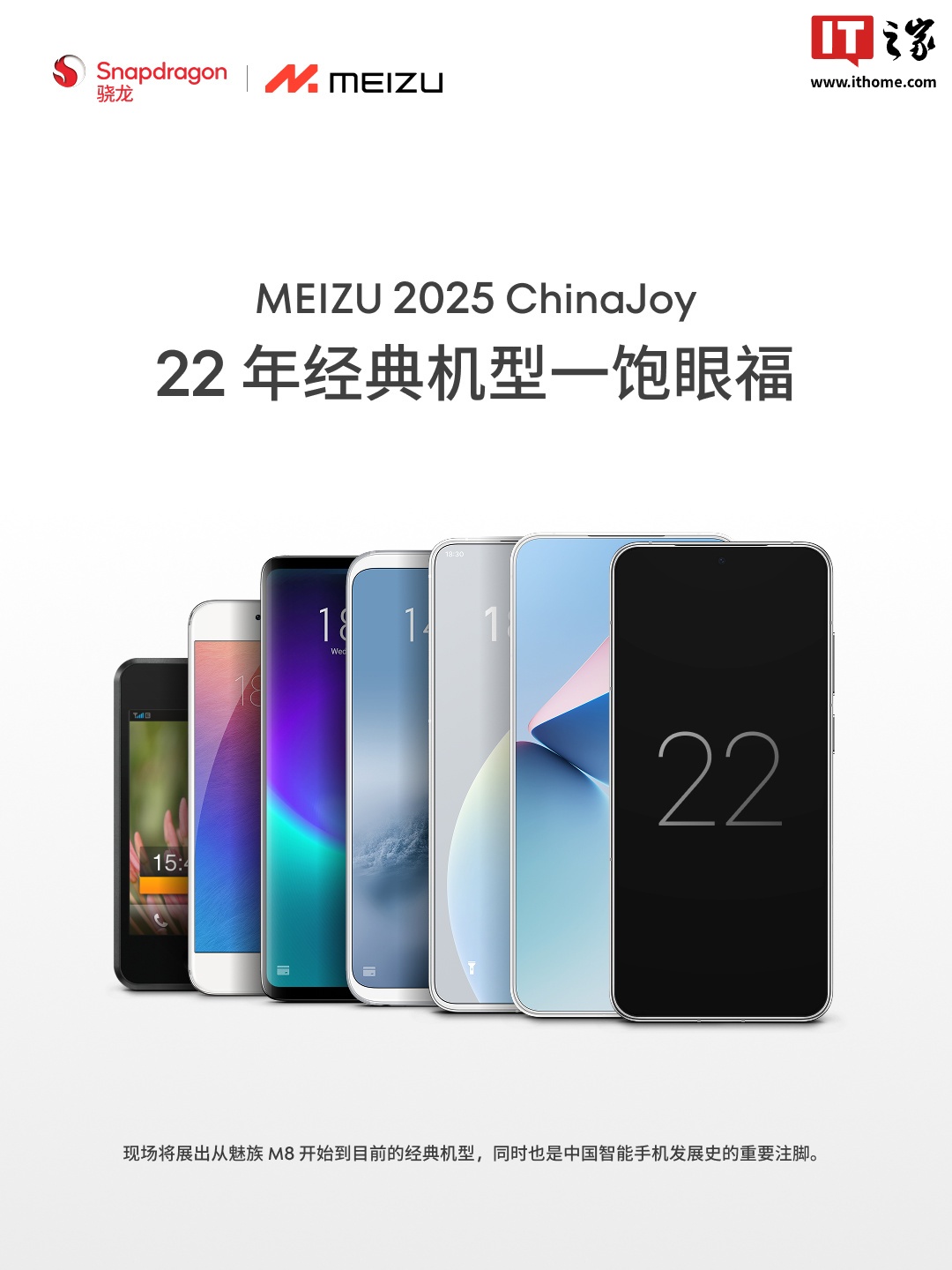 IT之家 7 月 31 日消息,魅族科技官方今日发文透露了其将在 2025 ChinaJoy 上准备的活动内容。据介绍,魅族打造了一条别具一格的「时间长廊」,将集中呈现历年经典手机产品,号称“一饱眼福”