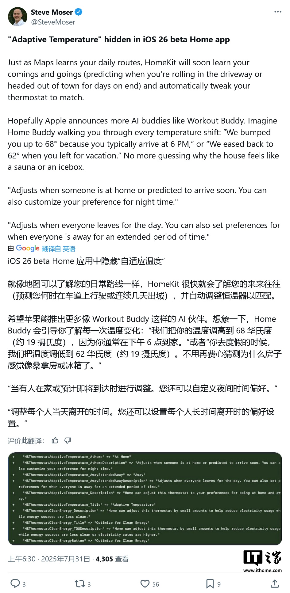 IT之家 8 月 1 日消息,开发者 Steve Moser 昨日(7 月 31 日)在 X 平台发布推文,称深入挖掘最新 Beta 版 iOS 26 系统代码后,发现苹果内部可能在酝酿名为“自适应温度”(Adaptive Temperature)的全新功能,有望加入到 Home 应用中。