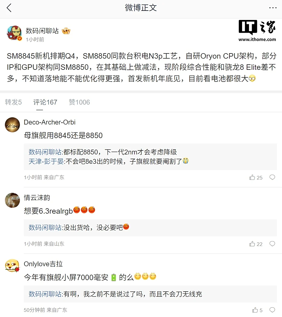 根据该博主此前爆料,SM8845 是 SM8850(IT之家注:骁龙 8 Elite 2 爆料型号)的“减配”版本,采用 SM8850 同款台积电 N3p 工艺,自研 Oryon CPU 架构,部分 IP 和 GPU 架构同 SM8850,在其基础上做减法,现阶段综合性能和骁龙 8 Elite 差不多,不知道落地能不能优化得更强,首发新机年底见,目前看电池都很大。