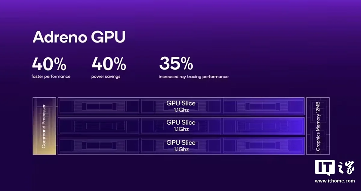 作为参考,骁龙 8 Elite(骁龙 8 至尊版)发布于 2024 年 10 月,采用台积电 N3E 工艺;搭载 Adreno 830 GPU,峰值性能提升 44%,能效提升 25%,频率 1100MHz ,具备 12M 独立缓存。