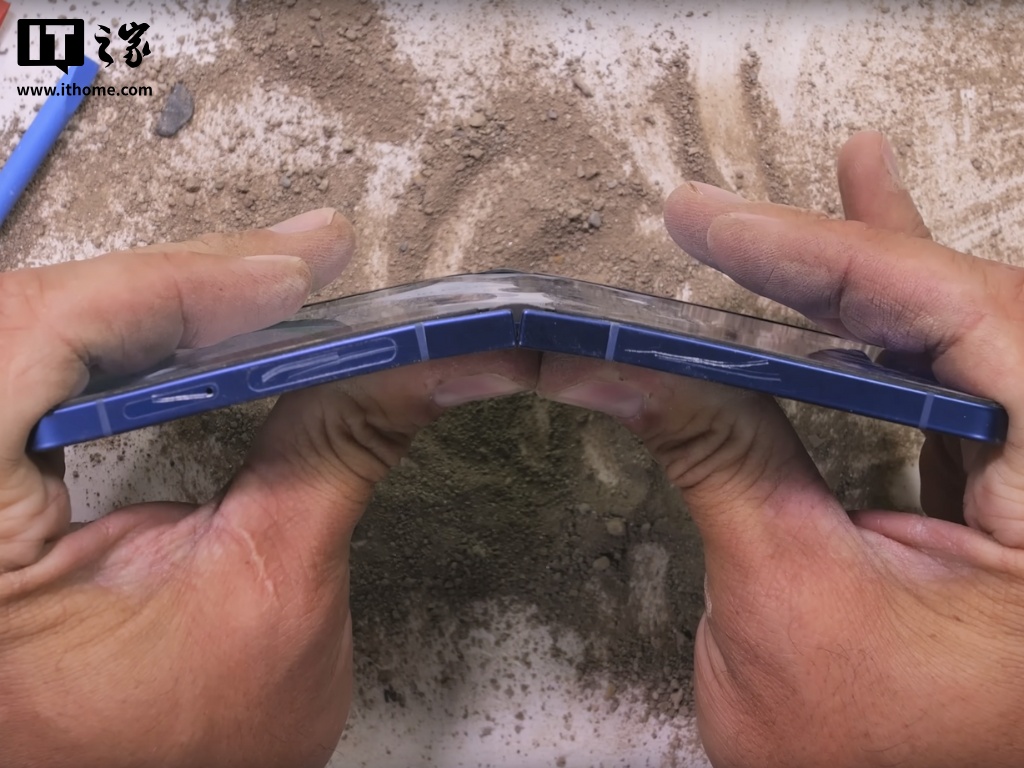 最后是弯曲测试,测试者用力将手机向后弯曲。虽然机身出现了明显变形,并在天线附近出现了轻微的折痕,但并未断裂或失效。第二次弯曲后,虽然手机发出了一些声响,但总体上仍然保持完整,三星的铰链设计似乎比前代产品有了显著改进。